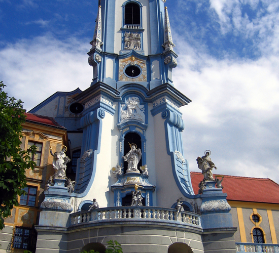 Der Stiftsturm, mit seinen auffälligen blau-weißen Farben, ist das Wahrzeichen von Dürnstein und ragt imposant über der Donau. Dieser barocke Glockenturm ist nicht nur architektonisch beeindruckend, sondern auch symbolisch von großer Bedeutung. Er repräsentiert den Aufstieg der Seele und ist ein wichtiger Teil der spirituellen Symbolik des Stiftes.