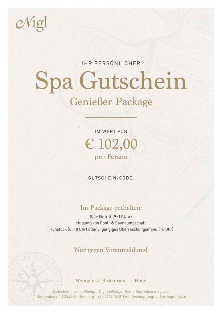 - SPA Gutschein GENIESSER PACKAGE - € 102 pro Person