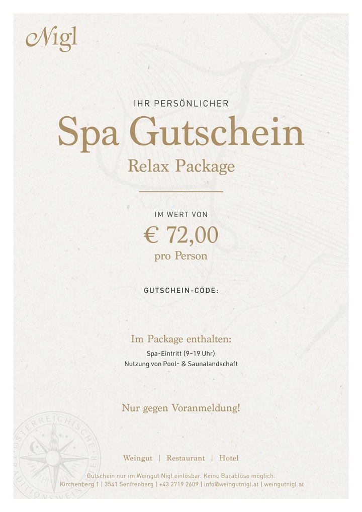 - SPA Gutschein RELAX PACKAGE - € 72 pro Person