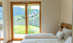 Weitblick über das Kremstal, großzügiger Wohnbereich Boden und Möbel aus Eiche, gemütliches Bett mit 25 cm Taschenfederkern Matratze, Schreibtisch, Fernseher, heller Raum mit breiter Fensterfront, angenehmes Raumgefühl mit Fußbodenheizung und Deckenkühlung, Badezimmer mit Dusche, Badewanne und geräumiger Ablage, separate Toilette.