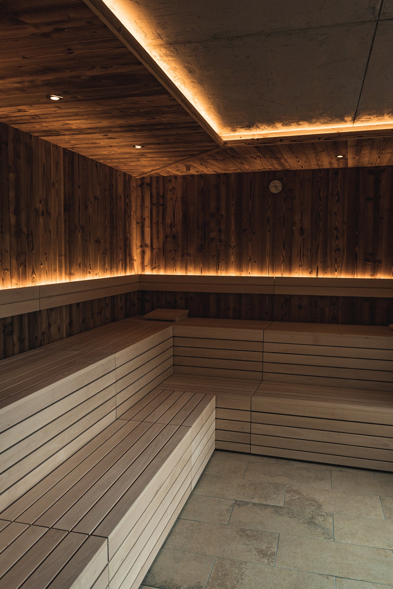 An kalten Tagen lässt sich im Saunabereich Kraft tanken. Der Saunabereich umfasst eine Biosauna mit Kräutern aus dem eigenen Garten, eine Finnische Sauna mit Blick ins Grüne und ein Dampfbad.