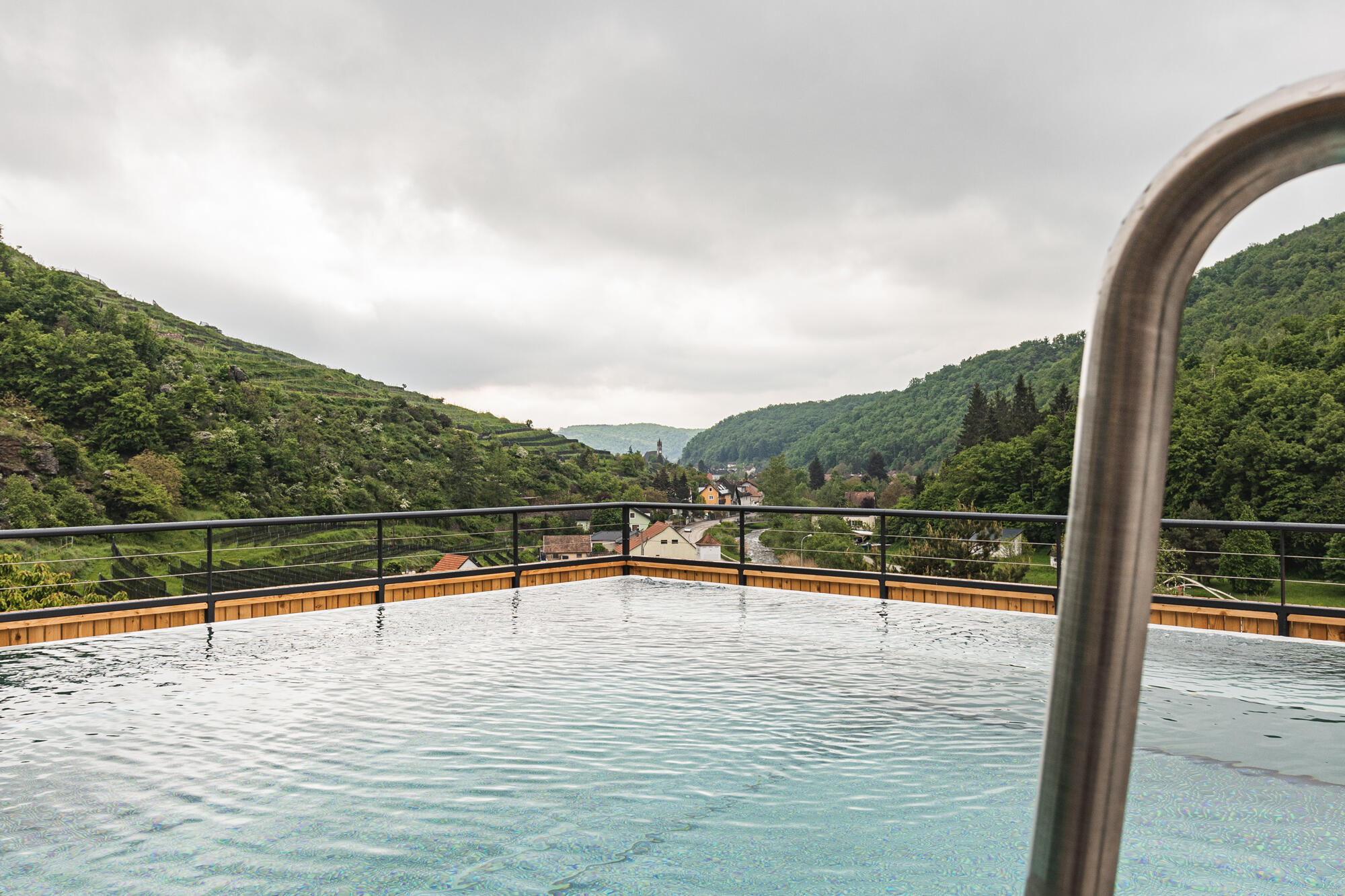 Das Highlight in unserem Spa ist der beheizte Infinitypool samt Whirlbank mit Panoramablick zur Burgruine Senftenberg und in die Landschaft des Kremstals.
