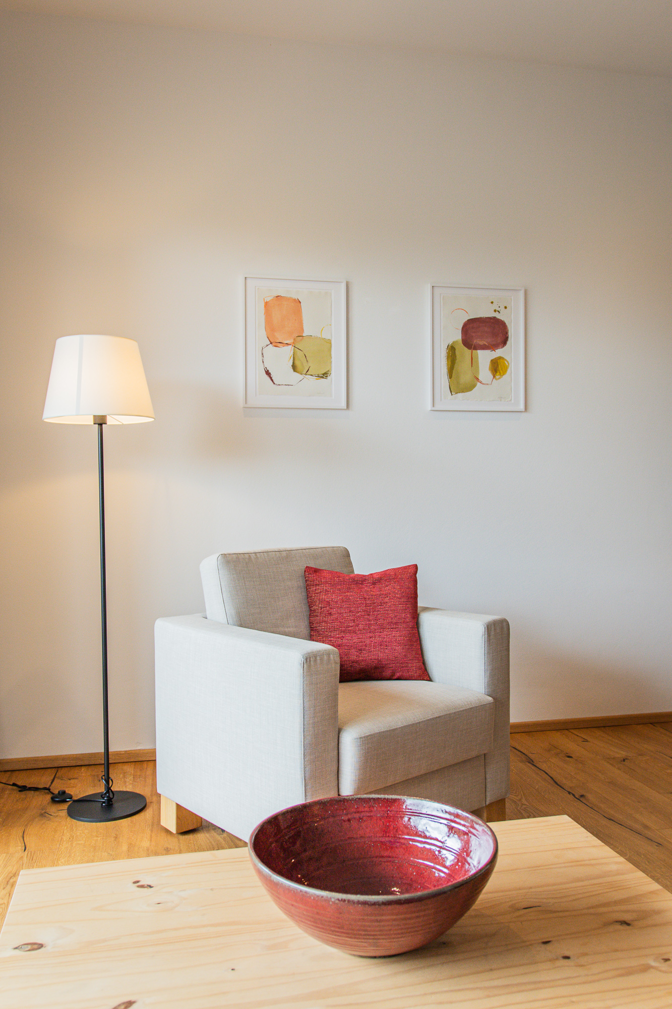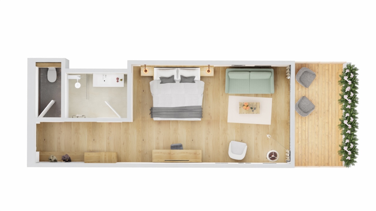 35 m2 plus spacious terrace, oak floor and furniture, comfortable bed with 25 cm pocket spring mattress, desk, living area with comfortable sofa, TV, bright room with wide window front, pleasant feeling of space with underfloor heating and ceiling cooling, bathroom with shower and spacious shelf, separate Toilet.