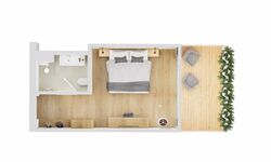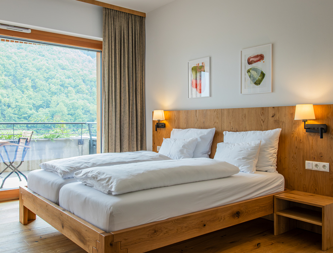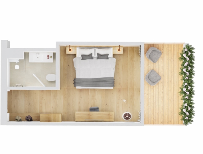 Floor and furniture made of oak, comfortable bed with 25 cm pocket spring mattress, desk, TV, bright room with wide window front, pleasant feeling of space with underfloor heating and ceiling cooling, bathroom with shower and spacious shelf.