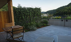 Wide view over the Kremstal, spacious living area Floor and furniture made of oak, comfortable bed with pocket spring mattress, desk, TV, bright room with wide window front, pleasant feeling of space with underfloor heating and ceiling cooling, bathroom with shower, bathtub and spacious shelf, separate toilet.