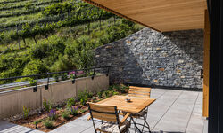 Panoramic view of the Kremstal, spacious living area, oak floor and furniture, comfortable bed with pocket spring mattress, desk, TV, bright room with wide window front, pleasant feeling of space with underfloor heating and ceiling cooling, bathroom with shower and spacious shelf, separate toilet.