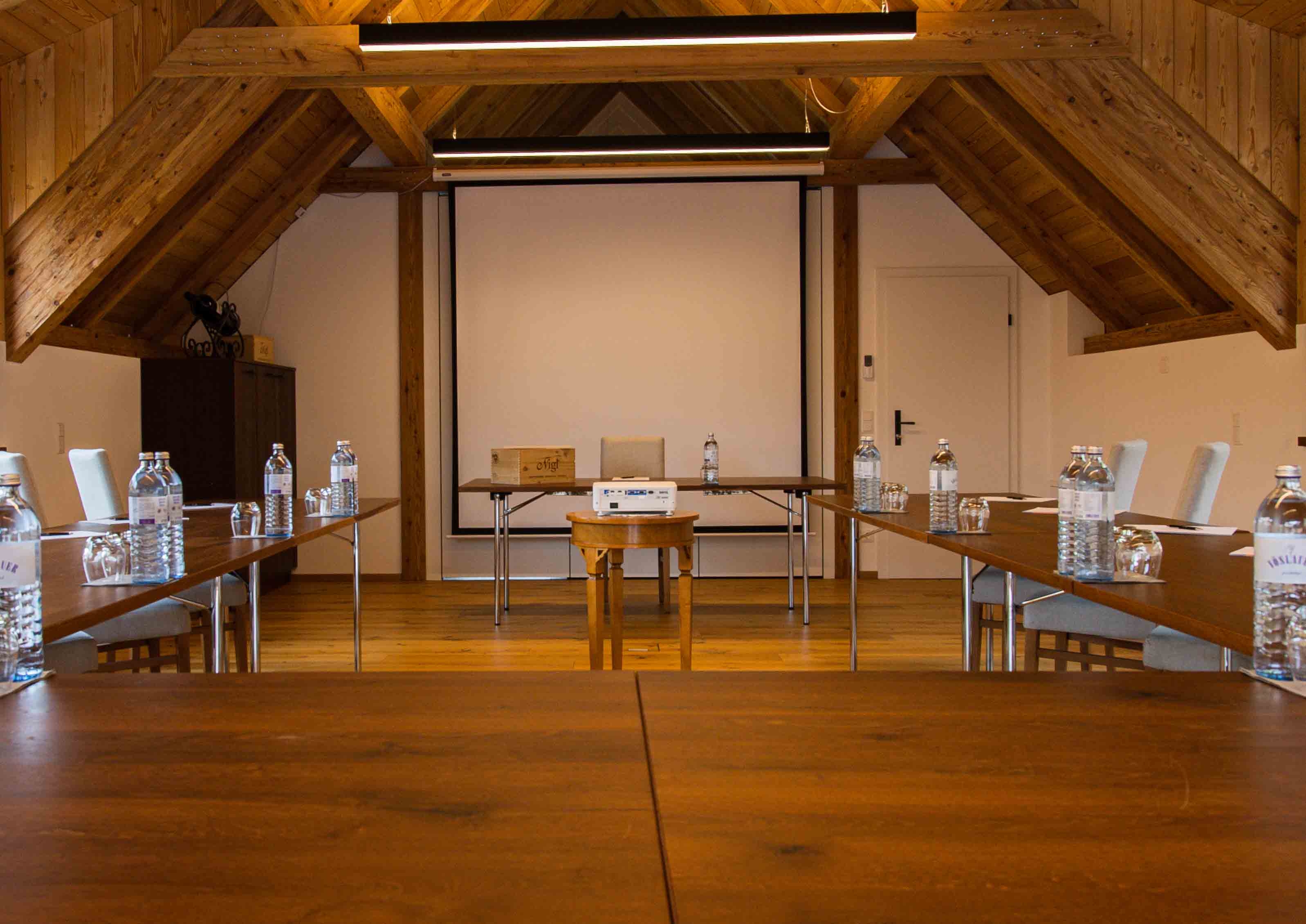 The bright, air-conditioned seminar room with terrace access is available in a U-shape, as a classroom, as a block and as an armchair circle and is suitable for up to 25 people.